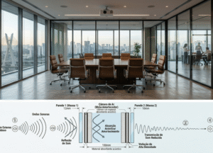 Barreira Acústica Superior: Se o mezanino abriga salas de reunião, o uso de vidro duplo é indispensável. Dessa maneira, isolamos o ruído das máquinas ou da circulação do térreo.